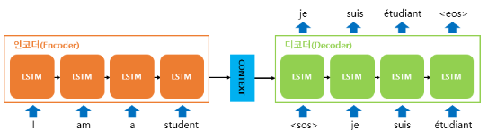 디코더 : 인코더로부터 전달받은 벡터를 이용해 W,X,Y,Z + <EOS>