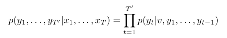 LSTM은 입력 시퀀스를 고정 크기의 벡터 표현 v로 변환하는데, 이 벡터는 LSTM의 마지막 은닉 상태에서 얻는다. 그다음, 이 벡터 를 초기 은닉 상태로 하여 표준 LSTM-LM (Language Model) 수식을 통해 출력 시퀀스에 대한 확률을 계산한다: