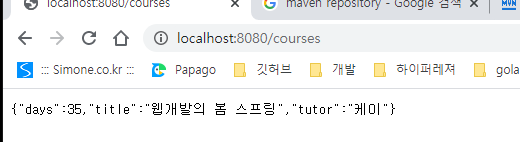 하지만 오늘 인강에서 json type을 반환할떄 RestController를 사용하면 된다는것을 알게되었다. 이것만 알았아도 3~4시간 뻘짓은 안할 수있엇는데... 간단하게 개념설명만하고 테스트한 이미지를 보고 마무리하겟습니다.