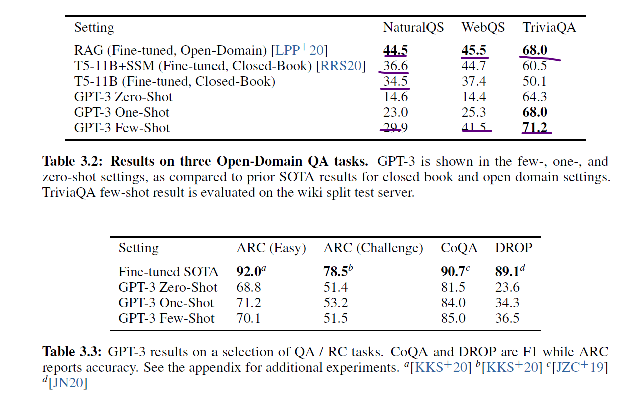 GPT-3 가 몇몇 분야에서는 SOTA와 비슷한 성능을 보이지만, 한계도 나타남