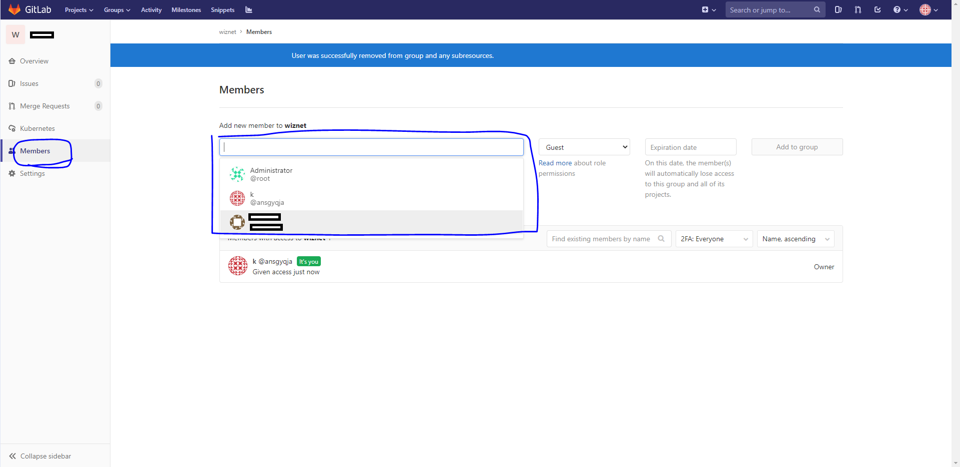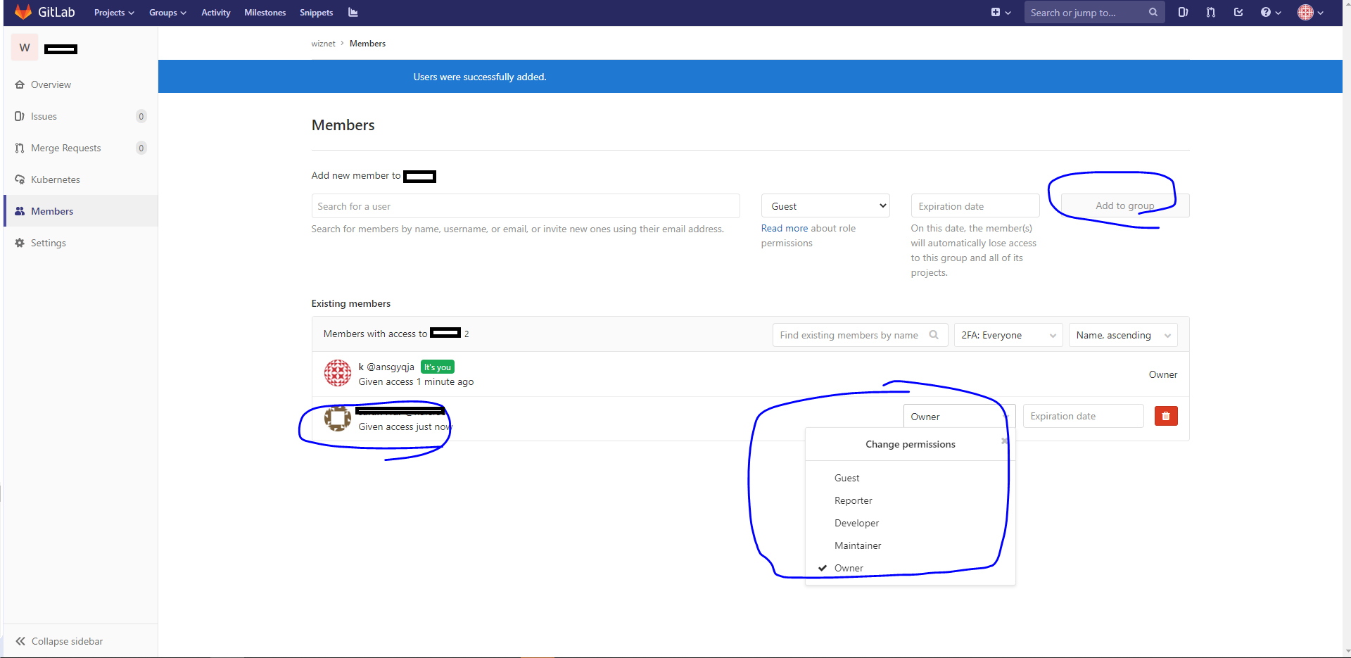 2. 멤버 초대 - member 버튼을 누른 후 검색을 누르면 회원가입한 유저리스트들이 보일거에요 . 거기서 자신의 그룹에 속할 유저를 누른후 add to group 을 눌러주시면 됩니다.