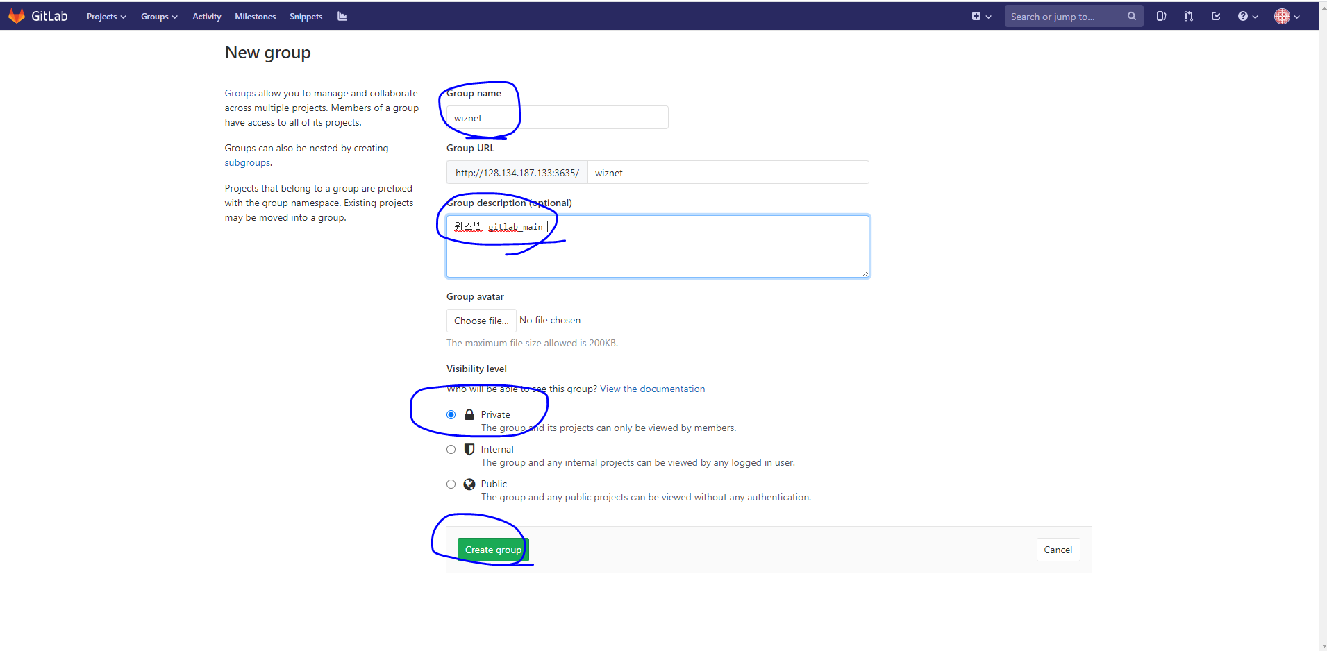 그룹 이름 지정 및 그룹에 대한 설명을 적은 후 create group 을 눌러주세요