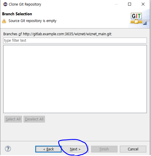 clone a git repository 를 눌러 gitlab 서버의 repository와 연결을 합니다.
