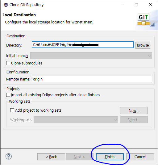 여기서 첫줄에 입력할 내용은 아까 proejct를 생성하고 나왓던 페이지에서 적혀있던 git clone ~ 이후 내용을 여기다가 붙여넣기해주면 나머지부분은 자동입력됩니다. 아이디와 패스워드만 추가로 입력해주시면되요