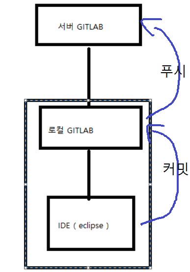 그리고 IDE에서 코드를 작성하다가 commit을 하면 로컬 GITLAB에 적용되고 , push를 하면 서버 GITLAb에 업로드하는 것 입니다.