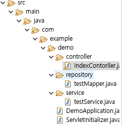 여기서 제가 생성한건 controller , repository , service 디렉토리와 거기에 포함되는 indexController.java , testMapper.java , testService.java 입니다