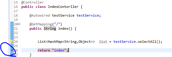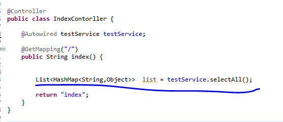 / 로 접근하면 testService에 있는 selectAll을 실행시키고 그 결과를 List<HashMap<String,Object>> 로 받는 모습입니다.