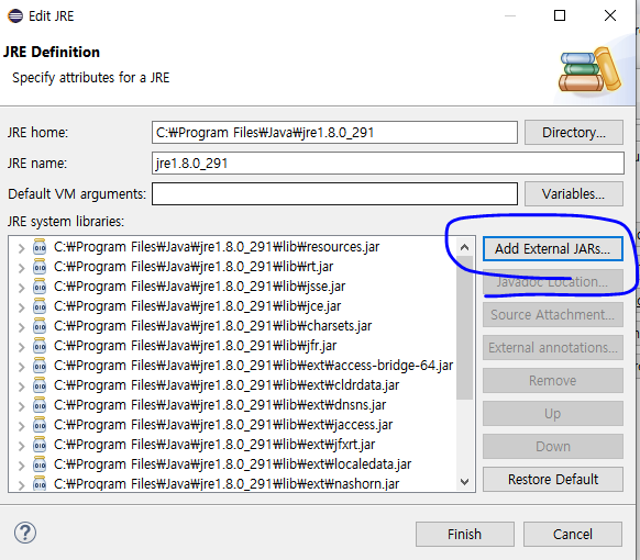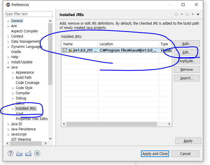 Java - installed JREs 로 이동한후 기본으로 설정된 jre를 누른 후 Edit