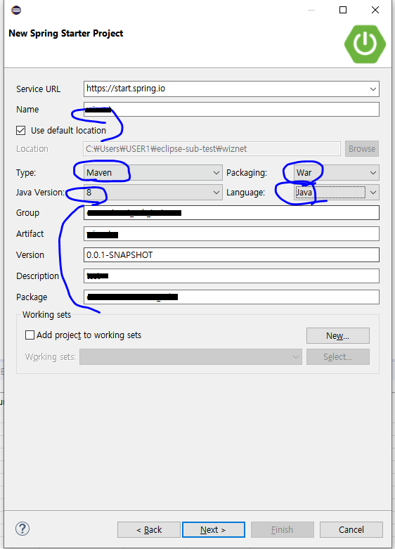 5. spring starter proejct를 누르고 다음넘어간 후 Name , Group , Artifact, Description , Package를 자신에게 맞게 입력한후 Type,Packaging, JavaVersion,Language를 선택해주세요.