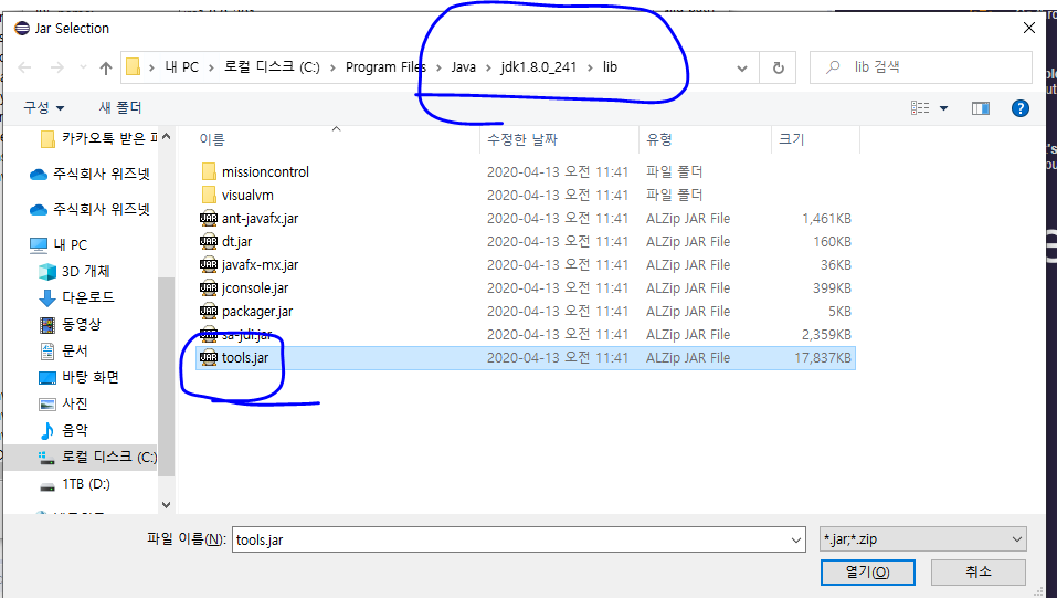 기존에 설치한 jdk파일을 찾아서 lib -> tools.jar 를 add해주세요