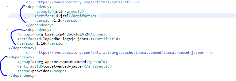 7.그리고 저희는 JSP 를 사용하는데 JSP를 사용하기 위해서는 이부분을 pom.xml 에 추가해줘야합니다.