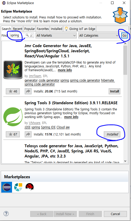 저는 설치를 미리 했지만 설치가 안되신분들은 spring을 검색한 후 go 를 누르면 Spring Tools 이 나올 것입니다 . install 버튼을 눌러주세요