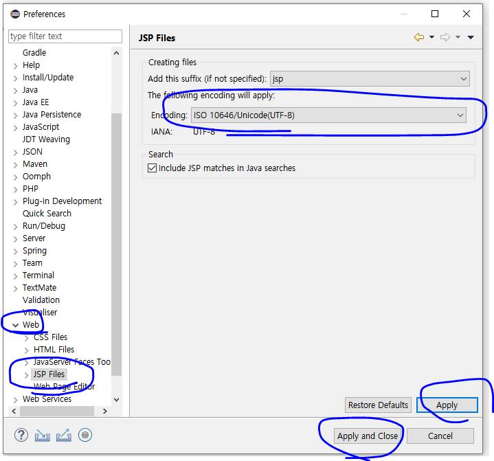 이건 window-preferences에서 Web- JSP Files -> UTF-8 ( 생성하는 JSP 파일 기본 설정 UTF-8 )