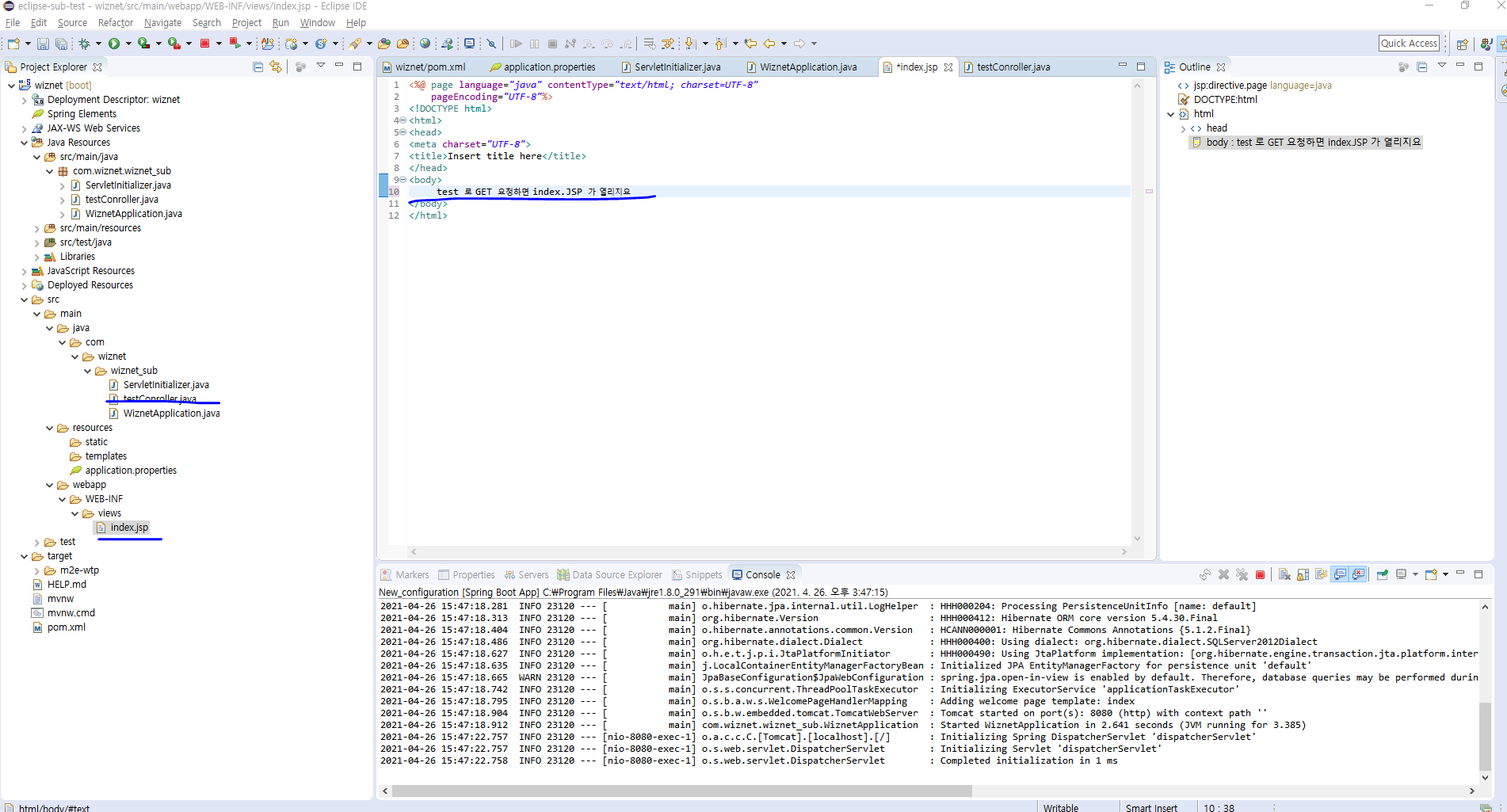 여기서 return 해주는 index는 저희가 위에서 만든 index.jsp 파일입니다.원래는 /WEB-INF/views/index.jsp 라고 적어줘야하는데 아까 application.properties에서 suffix,prefix를 설정했기 때문에 index라고만 입력해도 됩니다.