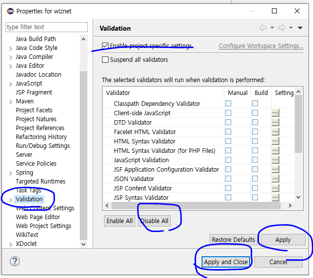 Validation - Enable Proejct - Disable All ( 빌드나 동기화할경우 validation 검사안함 )