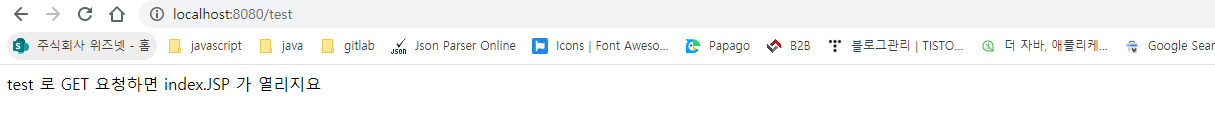 브라우저에 localhost:8080/test라고 입력하며 아래와같이 index.jsp 파일이 열릴 것입니다.