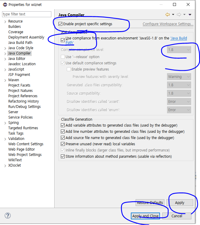 8. 다음은 개발에 부수적으로 영향을 미치는 부분인 Encoding 과 Validation ,Compiler를 셋팅할 차례입니다.