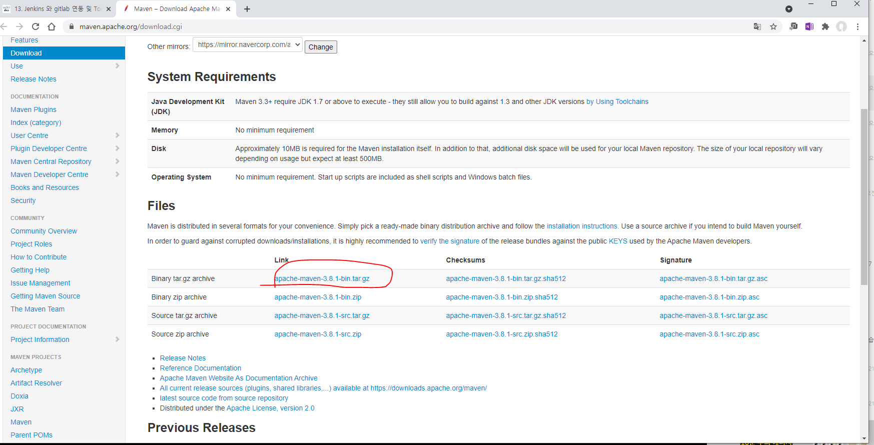 Downloading Apache Maven 3.8.1 Apache Maven 3.8.1 is the latest release and recommended version for all users. The currently selected download mirror is https://mirror.navercorp.com/apache/. If you encounter a problem with this mirror, please select anothe