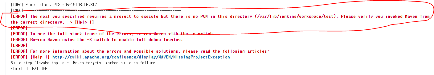 위에까지 작업하고 build를 했는데 아래와 같이 pom.xml을 못찾는다고 에러가 발생하였습니다.