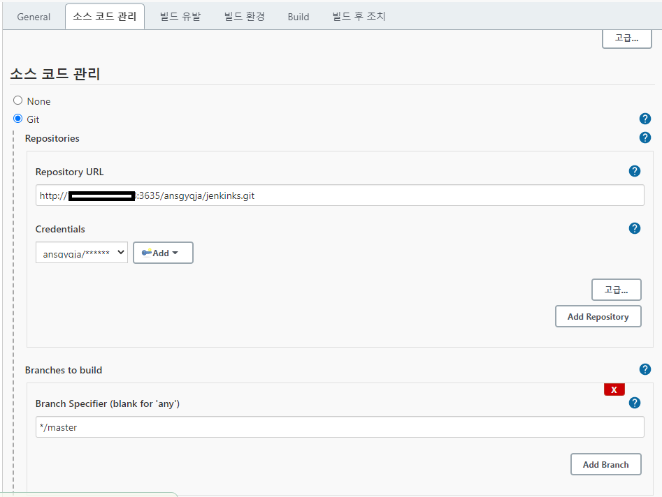 소스 코드관리로와서 자신의 git 서버 경로를 넣어주고 아까 만든 키를 넣어주면됩니다.