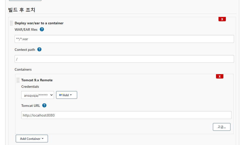 containers에 credentials 는 아까 위에서 만든 tomcat manager 아이디와 패스워드를 입력하시면됩니다.