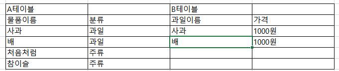 A테이블에 모든 물품이 들어있고 B테이블에는 이 물품중 과일만 담는경우 다음과 같이 사용할 수 있다