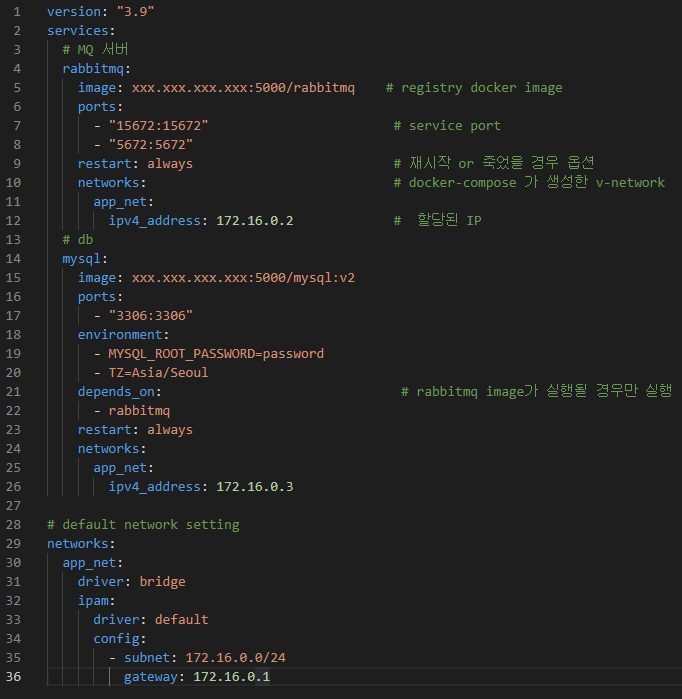 yaml 형식으로 작성한 이파일을 실행해주면 그안에 정의된 각각의 도커 실행 명령들이 실행되도록 되어있습니다.