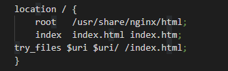 try_files 부분을 변경해주는것인데 요청한 uri 부분이 nginx 에서 설정한 root 폴더 내에 없는경우 index.html 보여주도록하는 부분입니다. 이부분은 다음에 한번 자세하게 공부해봐야할것같아요
