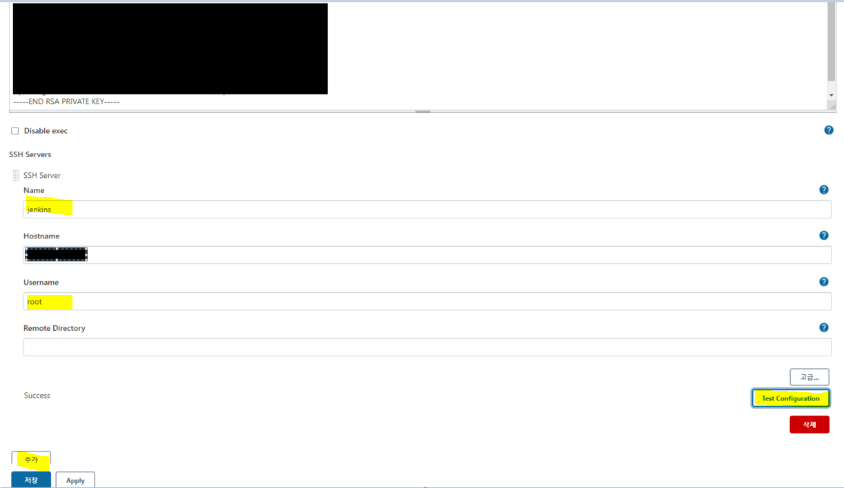 Test configuration을 눌렀을때 Success가 나와야 됩니다. 안나오면 키생성부터 다시해보세요.