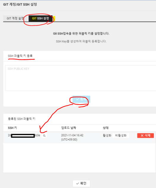git ssh 설정 클릭 - ssh 퍼블릭키 등록에 위에서 복사한 키를 넣어주시고 등록을 하면 아래 등록된 ssh 퍼블릭 키에 생성됩니다.