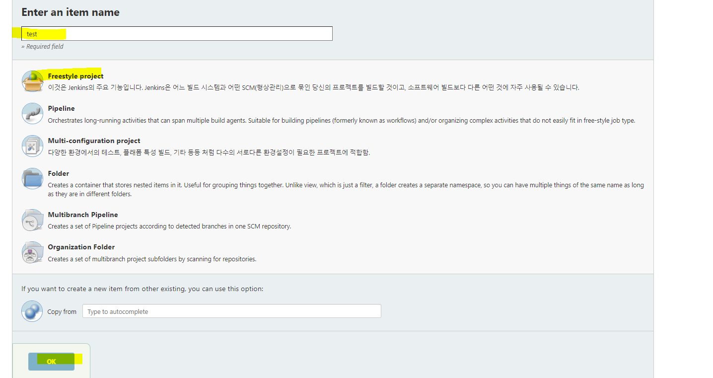 6. 이제 jenkins에서 item을 만들어 연동이 되는지 확인할 차례입니다.