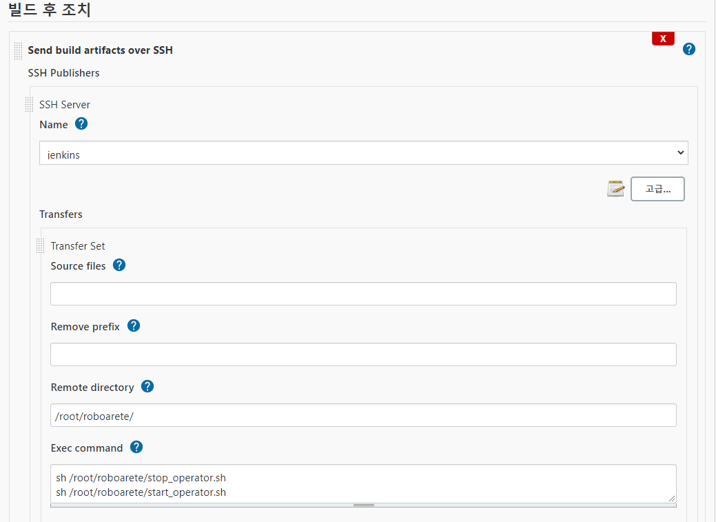 저는 파일을 원격서버로 넘길게 없어서 Exec command만 내용을 넣어줬습니다.