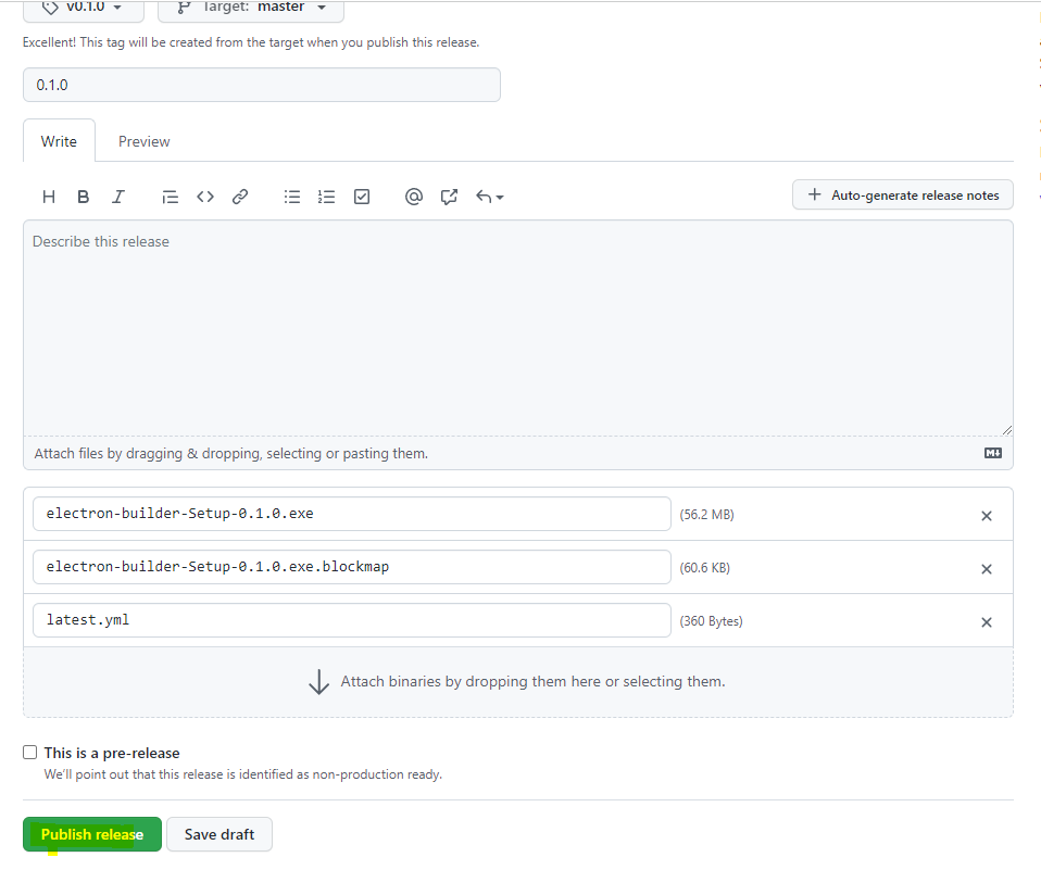 새로운 버전이 나올떄마다 build 해서 생겨난 electron exe 파일을 배포할 수 없기 때문에 github나 등등 프로그램에서 release 및 배포를 다음과 같이 도와줍니다.