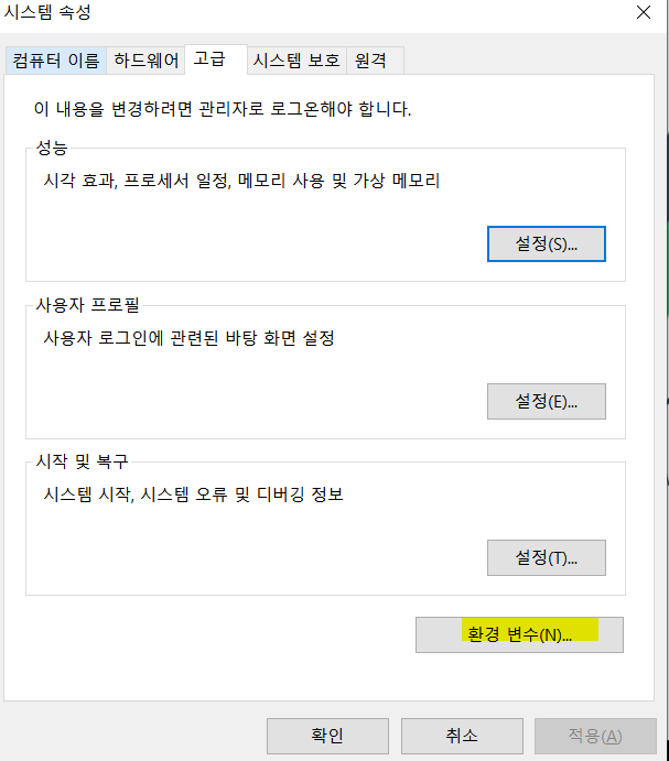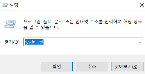 실행을 켠 후 -> sysdm.cpl