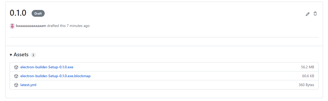 맨 아래쪽에 보시면 github release 에 태그와 버전을 생성하고 electron-builder-setup-0.1.0.exe 를 배포한것을 알 수 있습니다.