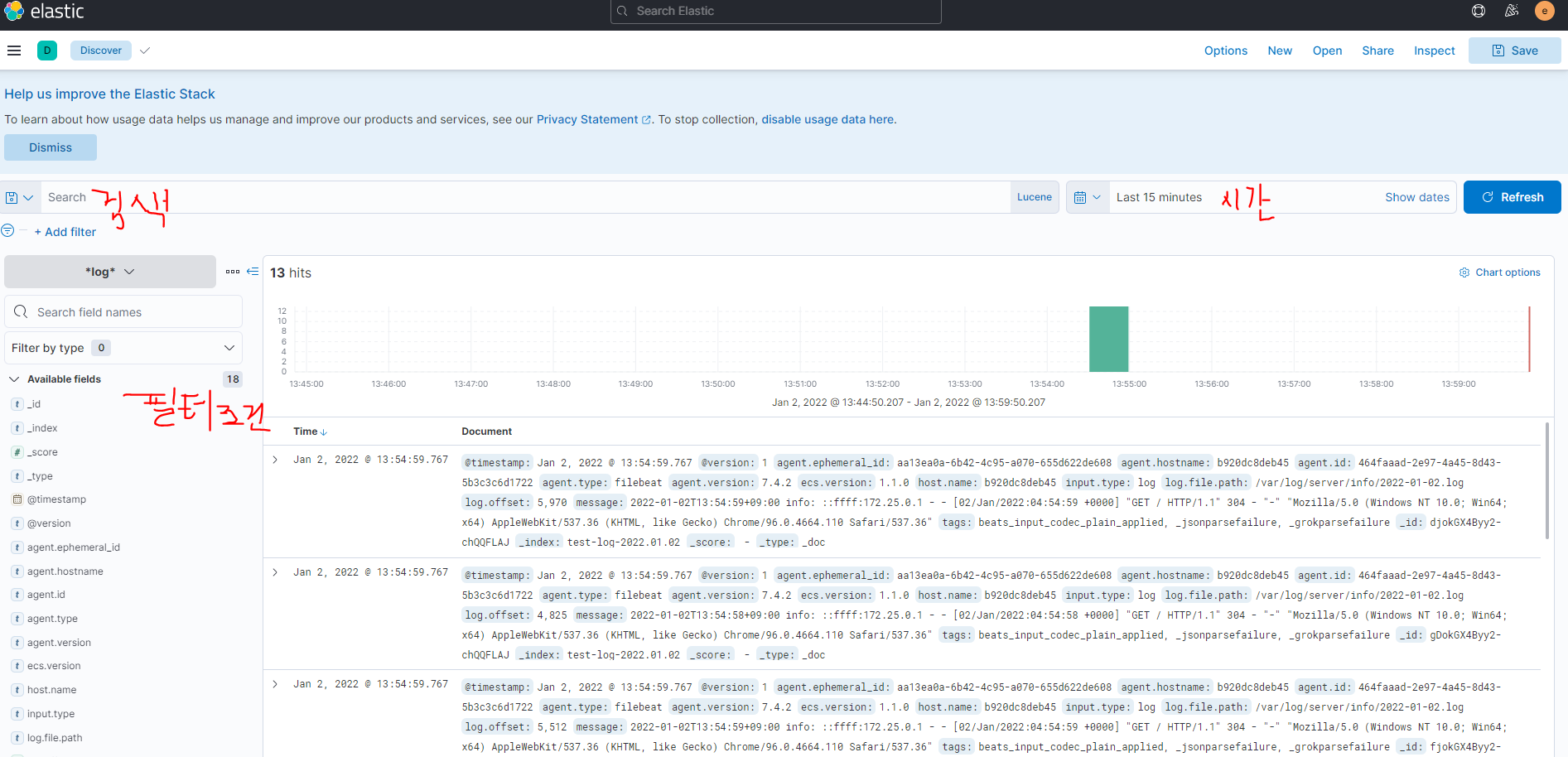 * 설명한 부분이란 : nodejs로그를 kibana에서 검색 및 시각화