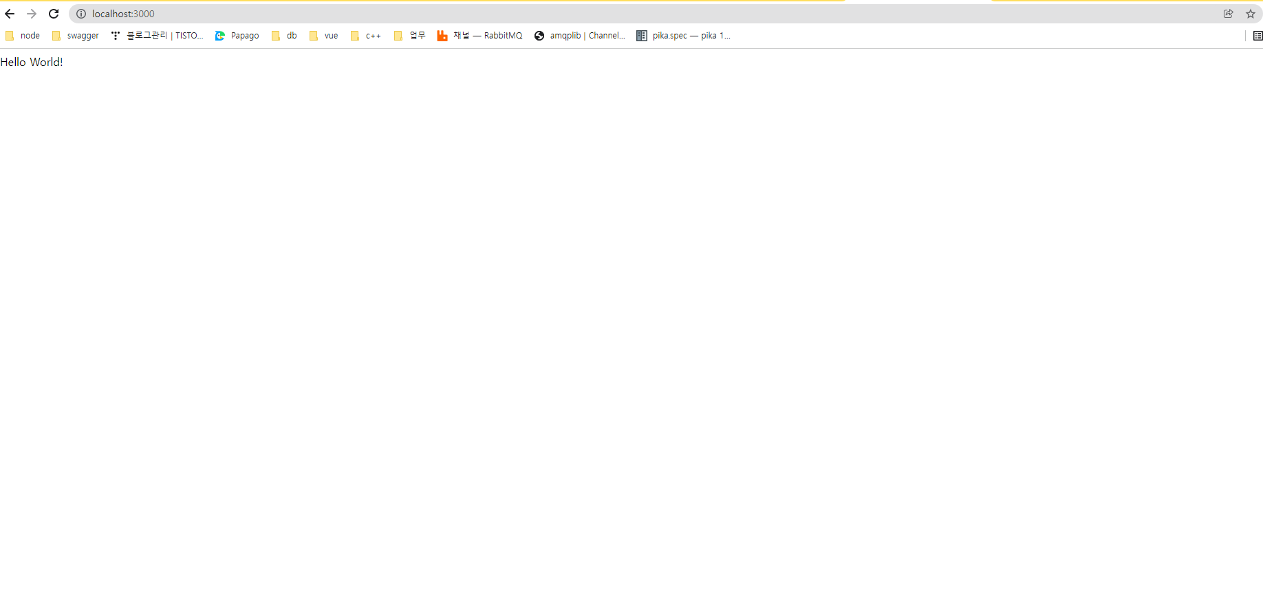 위처럼 정상 실행되고 브라우져를 통해 localhost:3000으로 접속하면 hello world가 보일것 입니다.