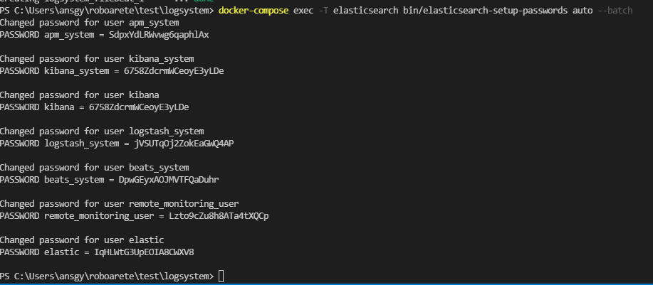 명령어 : docker-compose exec -T elasticsearch bin/elasticsearch-setup-passwords auto --batch