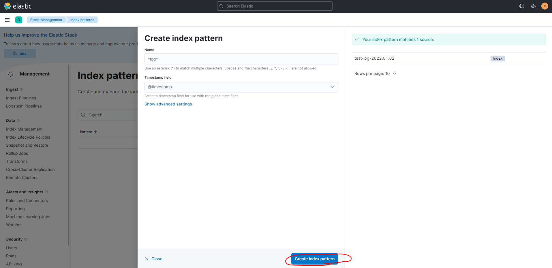 name에 *log* , timestamp filed 는 @timestamp로 하고 생성해주시면되요