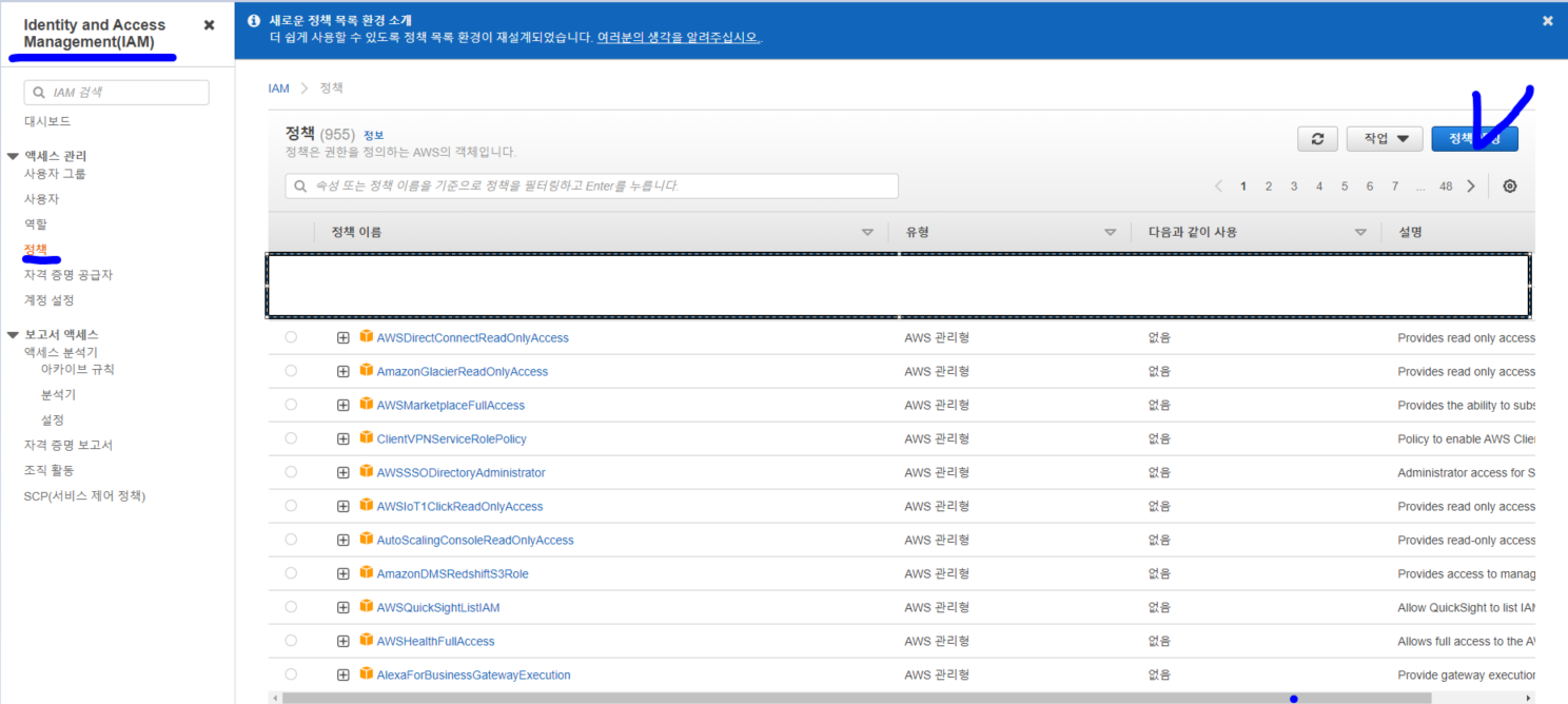 IAM -> 엑세스 관리 -> 정책 -> 정책 생성