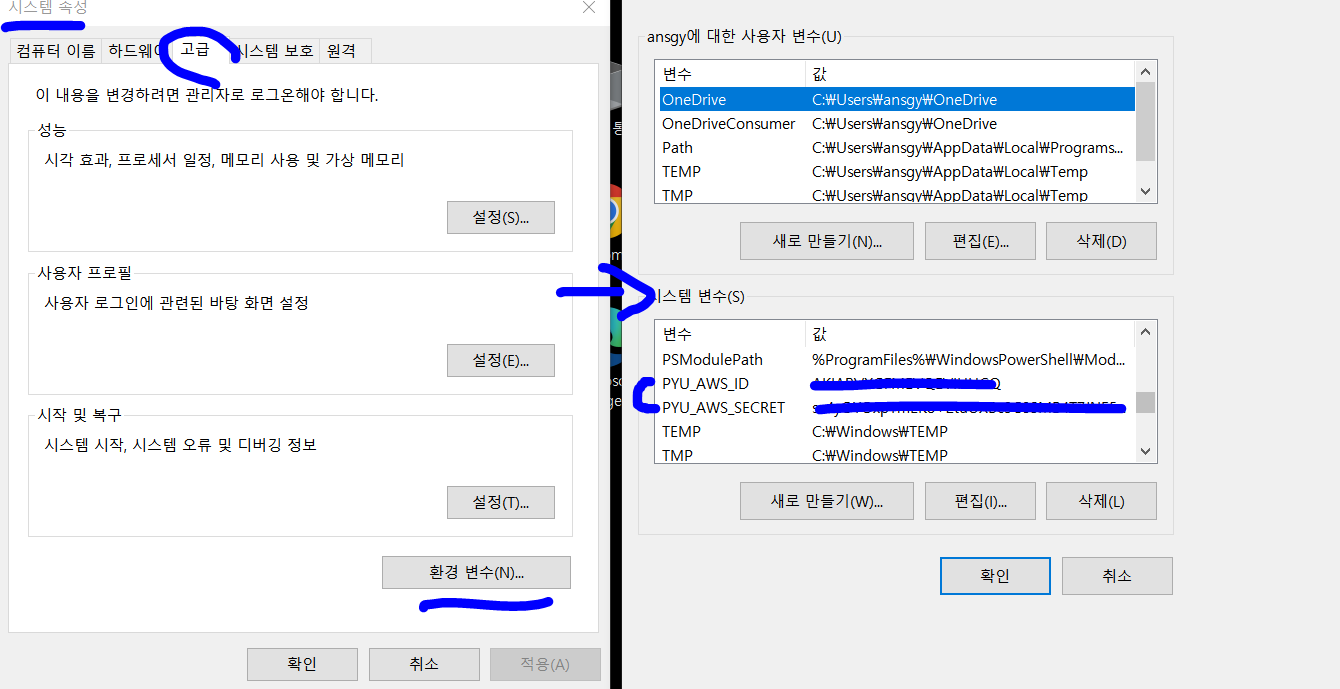4. 환경변수 설정 ( PYU_AWS_ID , PYU_AWS_SECRET )