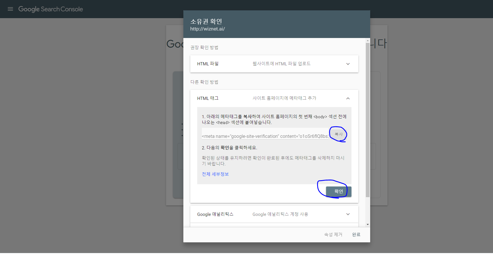 5. 이 중에 HTML 파일과 , HTML 태그 방식을 시도해봤습니다. HTML 태그 방식은 메인 페이지 HTML head에 아래와같이 복사한 부분을 추가 하고 확인을 눌르라고 되어있는데 저는 계속 에러가 발생하더라고요