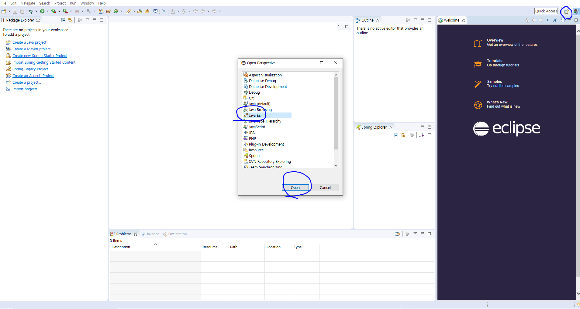 1. 일단 workspace를 만든후 오른쪽 위 버튼을 누르면 여러가지 모드중 JAVA EE를 선택해주세요