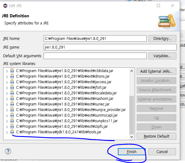 Java - installed JREs 로 이동한후 기본으로 설정된 jre를 누른 후 Edit