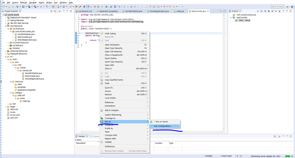 이제 프로젝트를 실행해볼게요 자바 파일에서 우클릭 -> run Configuration ->Spring Boot App