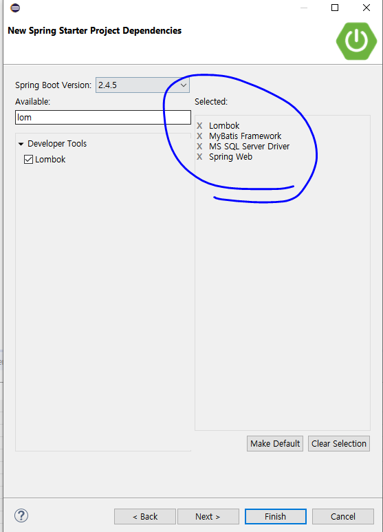 Spring Web은 필수로 추가해주고 사용하는 DB driver ( 저흰 MS-SQL 을 사용합니다 , Mysql을 사용하면 검색창에 Mysql 을 검색하시면 됩니다 ) , mybatis , Lombok ( Getter,Setter 자동 추가 라이브러리 ) 를 추가하면 됩니다.