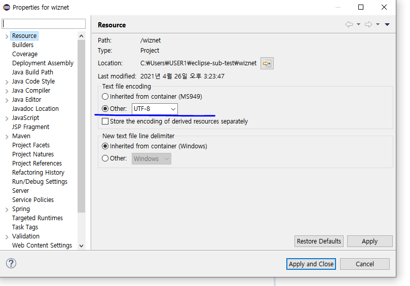 8. 다음은 개발에 부수적으로 영향을 미치는 부분인 Encoding 과 Validation ,Compiler를 셋팅할 차례입니다.