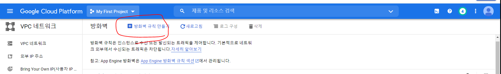 다시 gcp 콘솔로 돌아와서 왼쪽 버튼누르고 아래로 내리면 다음과같이 vpc 네트워크 -> 방화벽을 찾을수 있습니다