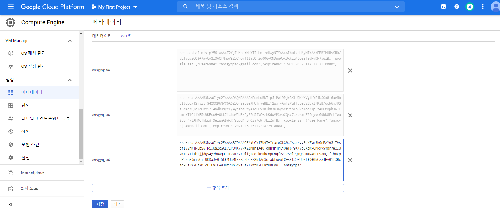 5. 메타데이터ssh 에 복사한 키 넣기