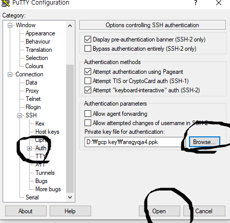 그다음 왼쪽 nav 에서 connection - > ssh -> auth 를 눌른후 private key 넣는곳이잇어요 거기서 아까 만든 ppk키를 넣어주면 됩니다.
